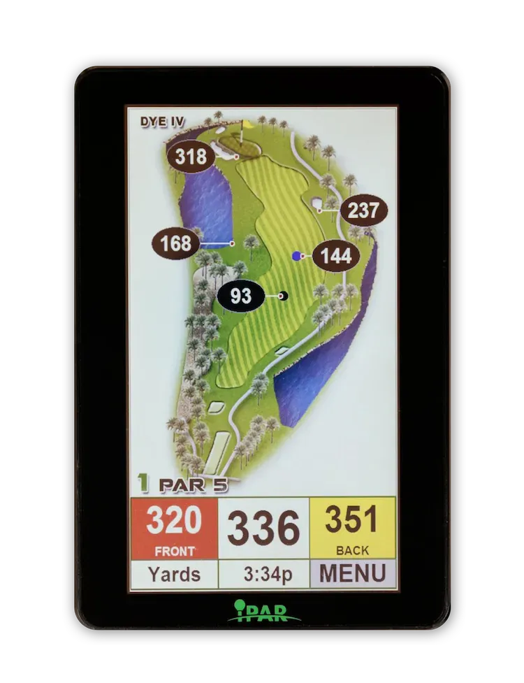 We use iPar GPS units that easy and simple to use. They give distances to the front, middle, and back of the green. They also display important messages and keep track of your pace.